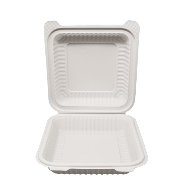 Almacena todo tipo de alimentos desde fríos, calientes o hasta con caldo como guisados, enchiladas, chilaquiles, cortes de carne, o comida china entre muchos más con la Almeja Cuadrada 8×8″ de Fécula de Maíz Biodegradable.